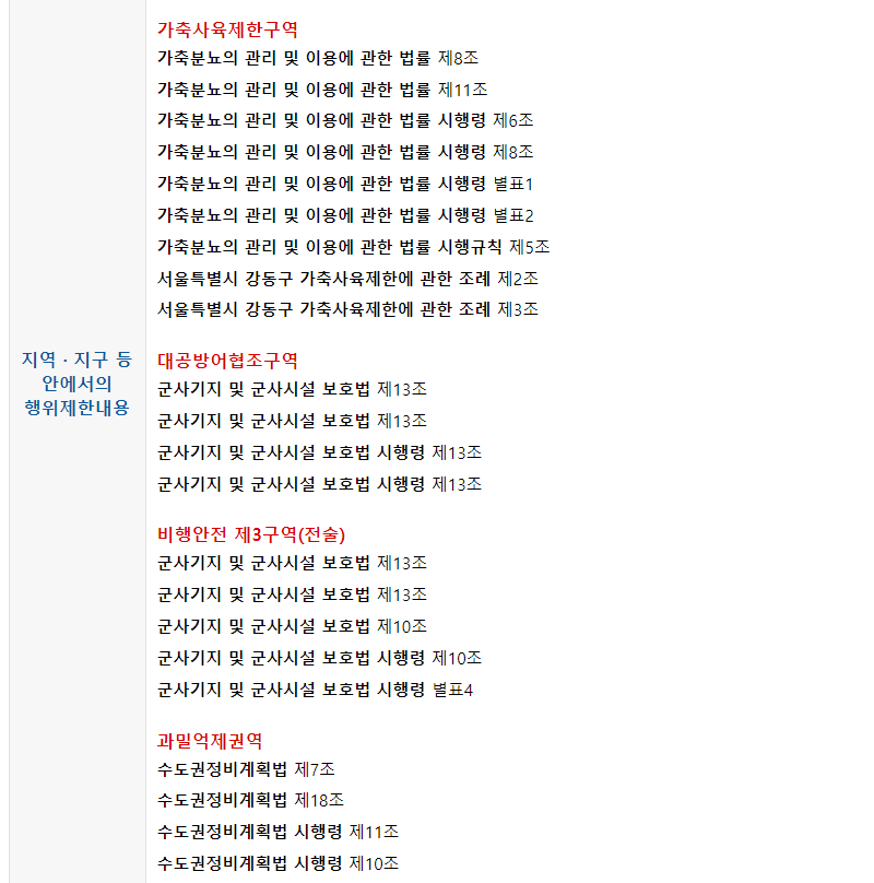 하단으로 스크롤을 내려보면 아래와 같이 해당 필지에 적용되는 법령 등의 조항이 나열되어 있으며, 클릭해보면 해당 조항의 상세 법조문이 아래로 펼쳐져 직접 규제 내용을 확인 할 수 있다.